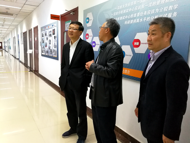 2018年4月23日,北京市市长陈吉宁一行来到分析测试中心视察,校党委书记赵长禄、校长助理龙腾等校领导陪同视察。中心主任彭绍春就中心的建设与运行情况向陈吉宁市长一行做了详细的汇报,并带领到访领导参观了中心的大型仪器设备。陈吉宁详细询问了各类仪器设备的运行和校内外服务保障情况,并与中心质谱室责任教授徐伟老师就仪器设备研发进行了深入交流。