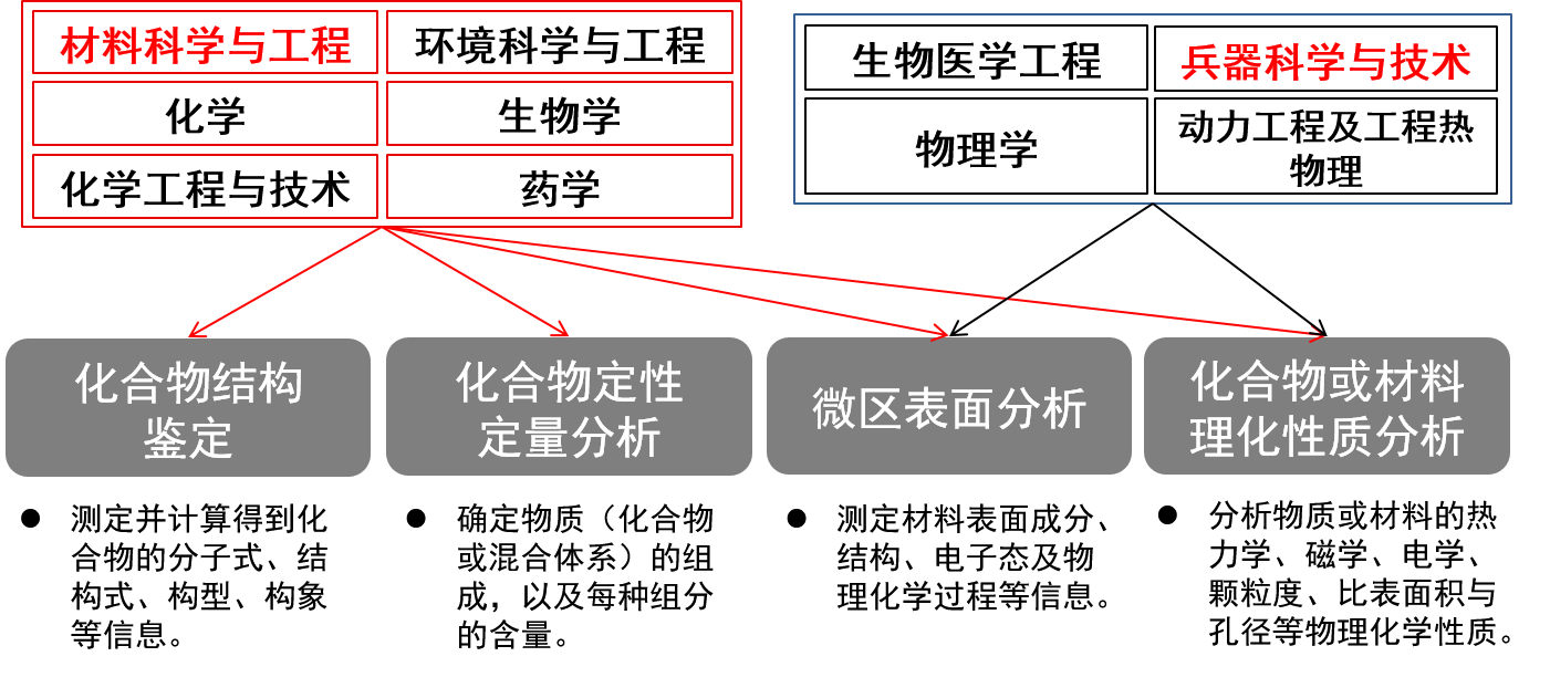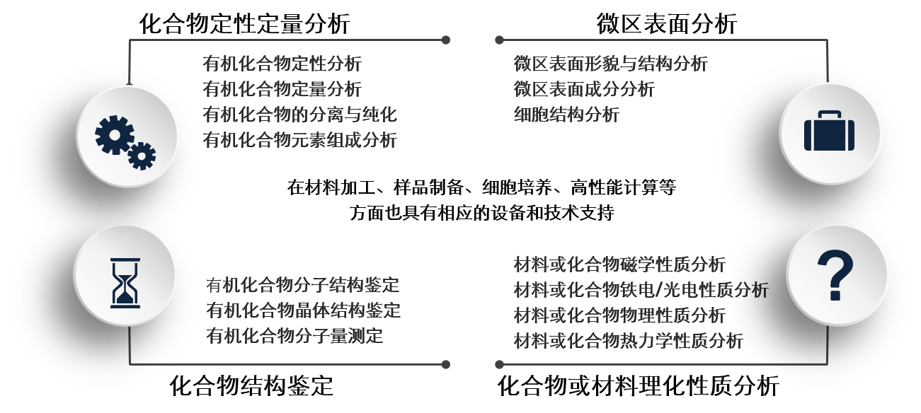 中心着力打造成为为学校化学、化学工程与技术、材料学、生物学、物理学、环境科学与工程、生物医学工程、机械工程、兵器科学与技术等多个学科提供分析测试服务的公共基础研究平台。中心以有机化合物定性定量分析、微区分析、有机化合物结构鉴定、化合物或材料理化性质分析等4个业务大类为核心,可完成15大项、数百个子项目的测试分析工作。