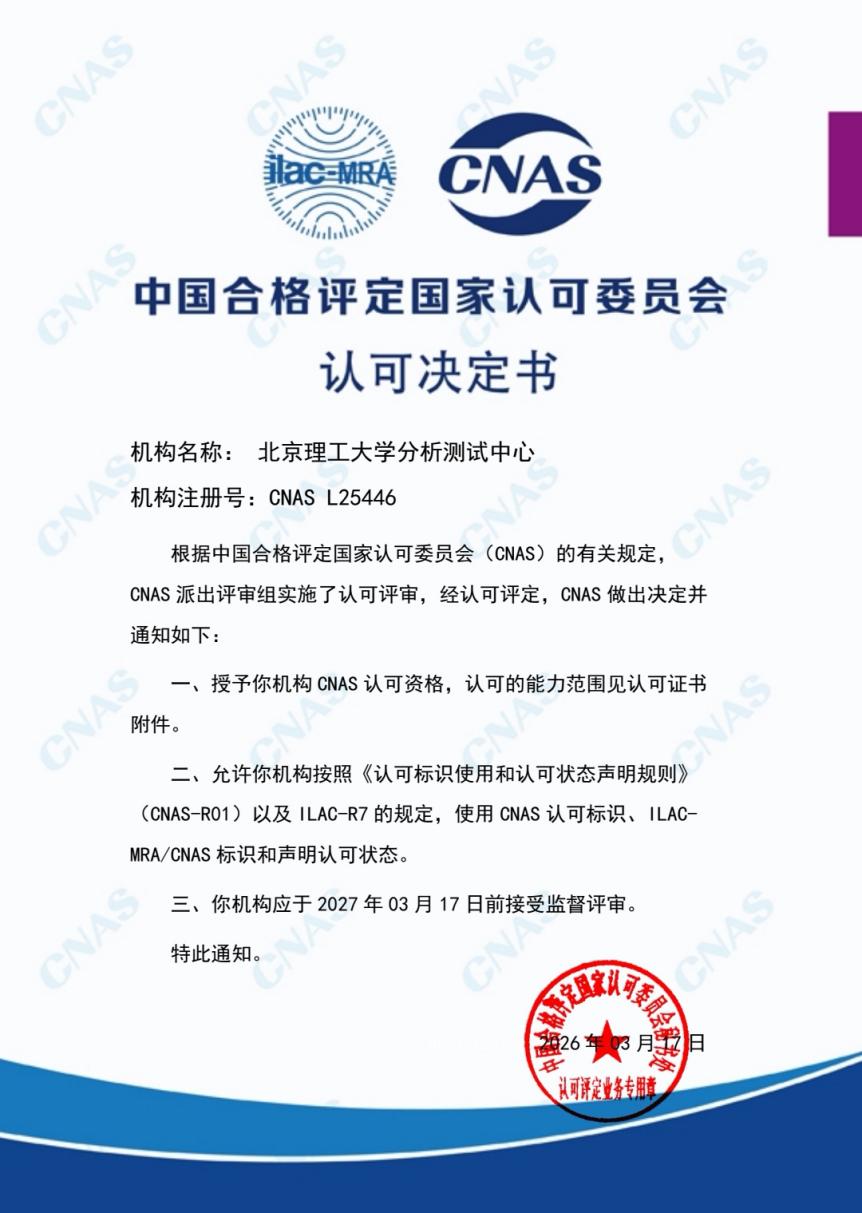 以此为新的起点,中心将严格遵循认可准则要求,持续深化准则意识,不断完善质量管理体系,进一步提升分析测试能力和综合服务水平;充分利用CNAS国际互认的平台优势,积极为校内外科研机构、企业和相关单位提供更规范、更精准、更具公信力的分析测试服务,出具国家认可、国际互认的权威检测报告,为学校“双一流”建设和科技创新发展提供有力的技术支撑,并为服务国家战略需求和区域经济社会发展贡献更多力量。