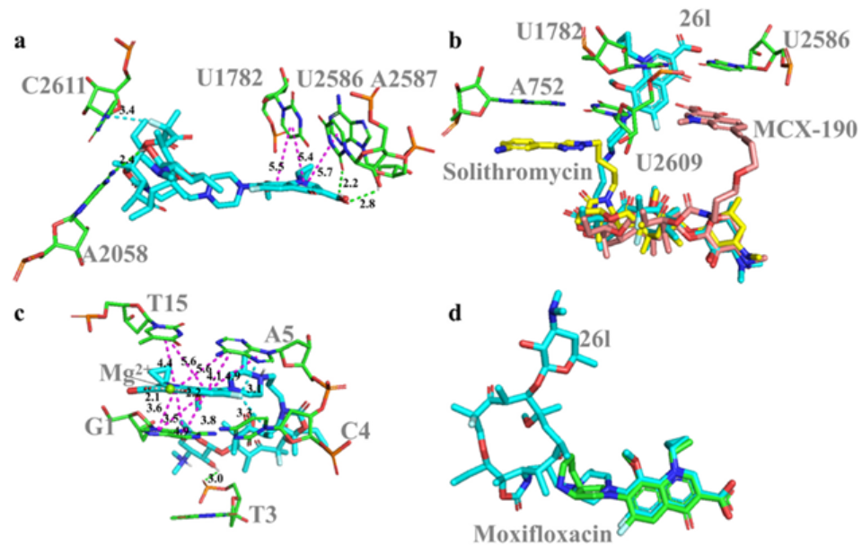 团队通过使用分子对接的方法验证了化合物除了能作用于大环内酯和喹诺酮抗生素原有的靶点,还与核糖体和gyrase的新位点有额外的作用力。这项工作通过双靶标理性设计提供了一种应对抗生素耐药性的创新方法,并提供了抗耐药菌抗生素新的范例。