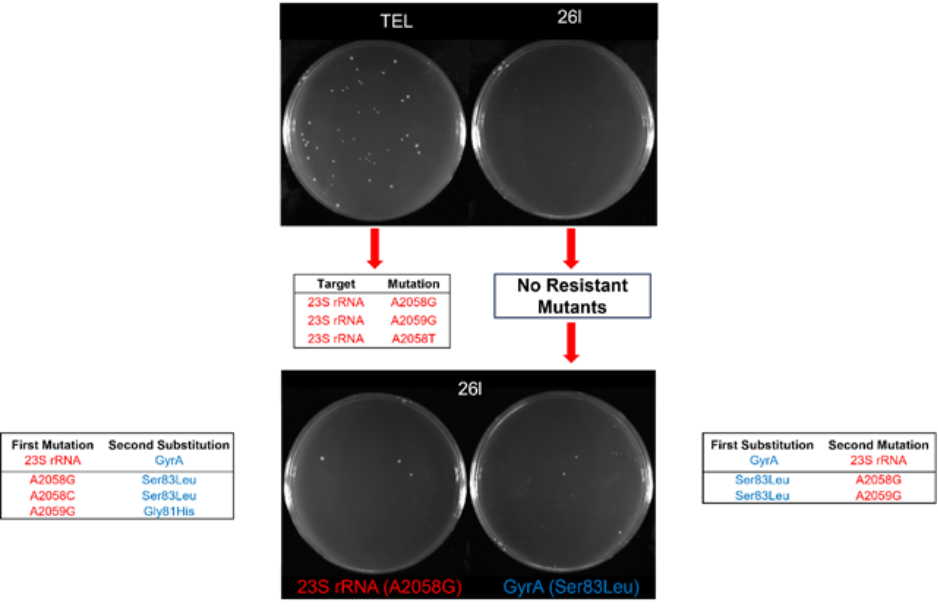 通过机制研究,团队发现化合物能同时作用于核糖体以及DNA Gyrase,呈现双靶标效应。并且进一步验证了化合物能够使细菌不易引起耐药突变。