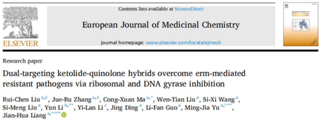 论文信息:Liu, R. C., Zhang, J. R., Ma, C. X., Liu, W. T., Wang, S. X., Liu, S. M., Li, Y., Li, Y. L., Ding, J., Guo, L. F., Yu, M. J., & Liang, J. H. Dual-targeting ketolide-quinolone hybrids overcome erm-mediated resistant pathogens via ribosomal and DNA gyrase inhibition.European journal of medicinal chemistry,(2026) 305, 118562.https://doi.org/10.1016/j.ejmech.2026.118562
