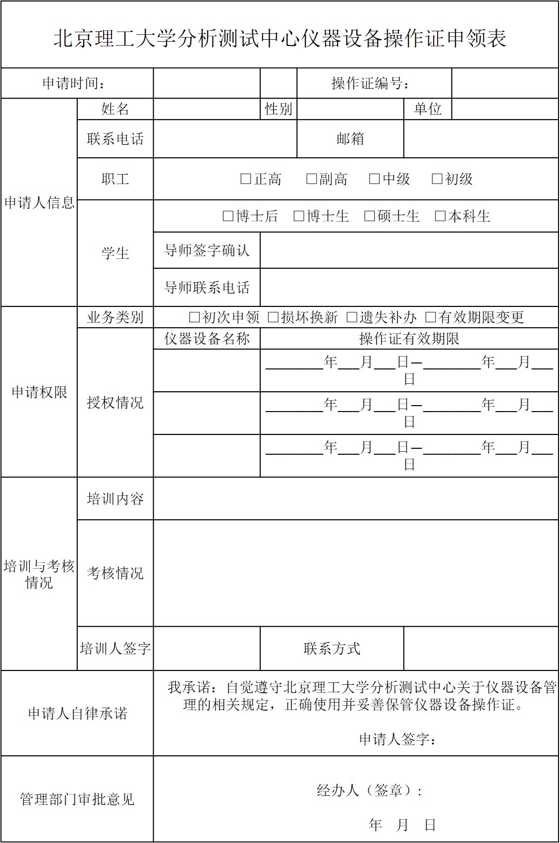 分析测试中心仪器设备操作证申领表