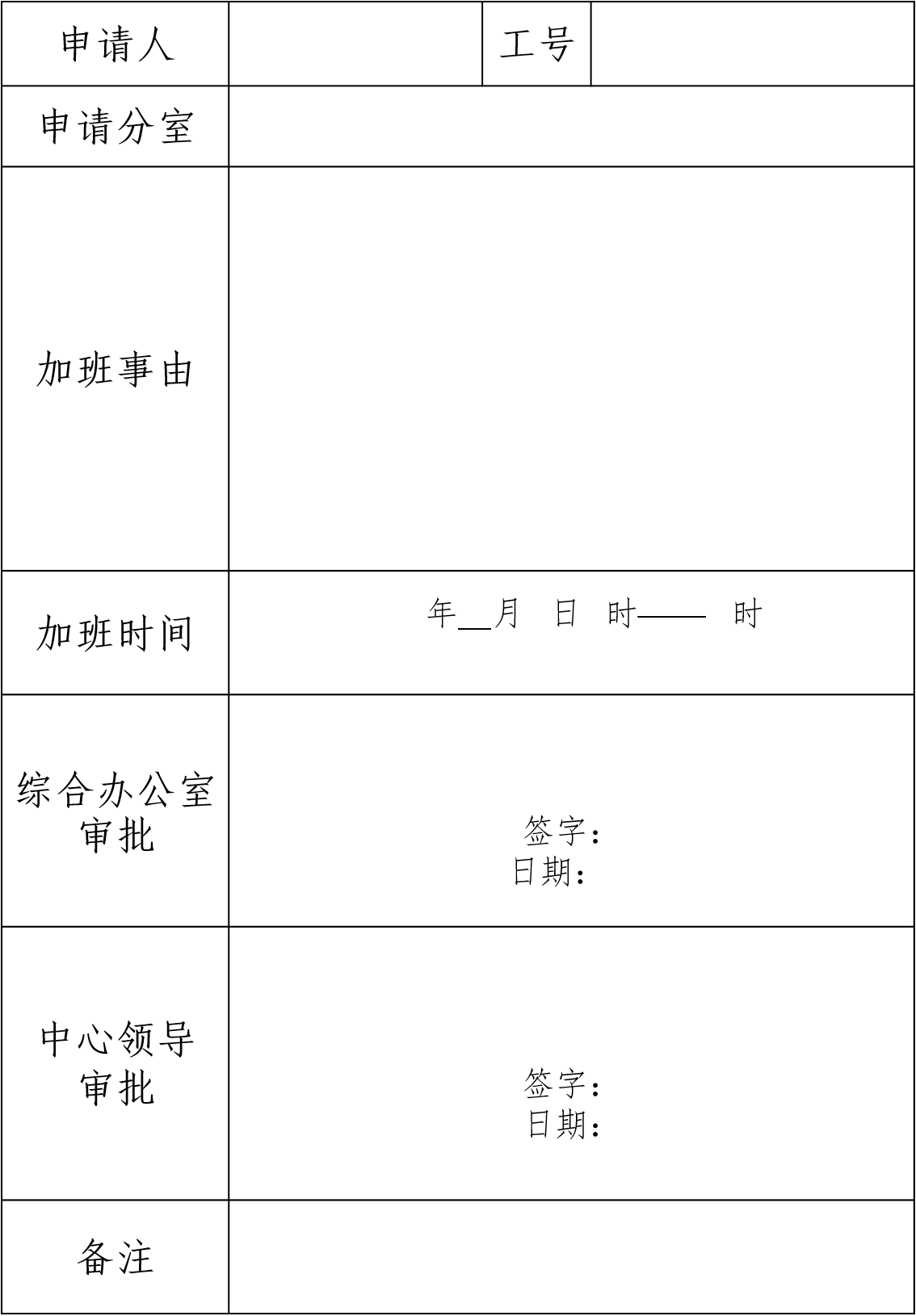 注:申请人员须如实填写此表,加班任务完成后交由中心财务负责人保管,无此表不予计发对应的加班费。