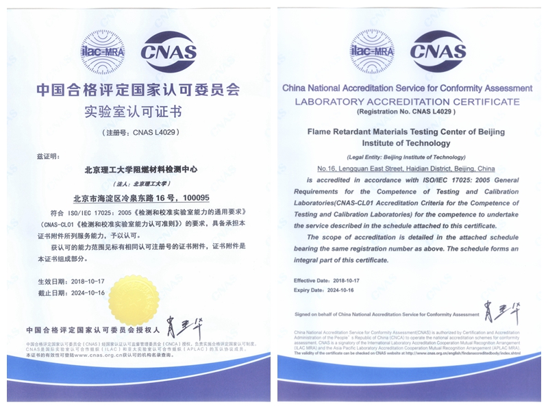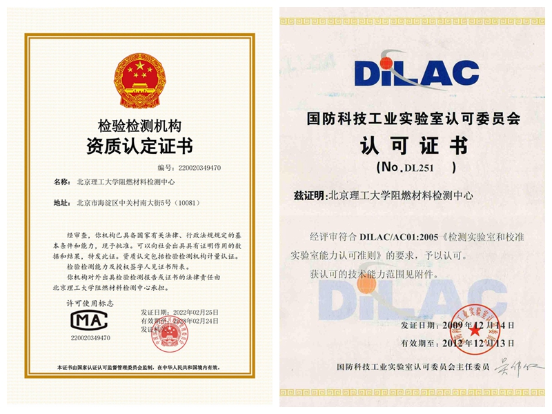 中心具有国家认证认可监督管理委员会计量认证证书(CMA)、国家认证认可监督管理委员会资质认定授权证书(CAL)、中国合格评定国家认可委员会实验室认可证书(CNAS)和国防科技工业实验室认可委员会认可证书(DILAC)。目前已具备6个检测项目的检验能力,涉及到国内外标准15个,立足房山,面向社会开放,为校内外用户出具检测报告,进行性能评估、质量控制、技术咨询等为客户提供第三方技术支持服务。